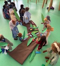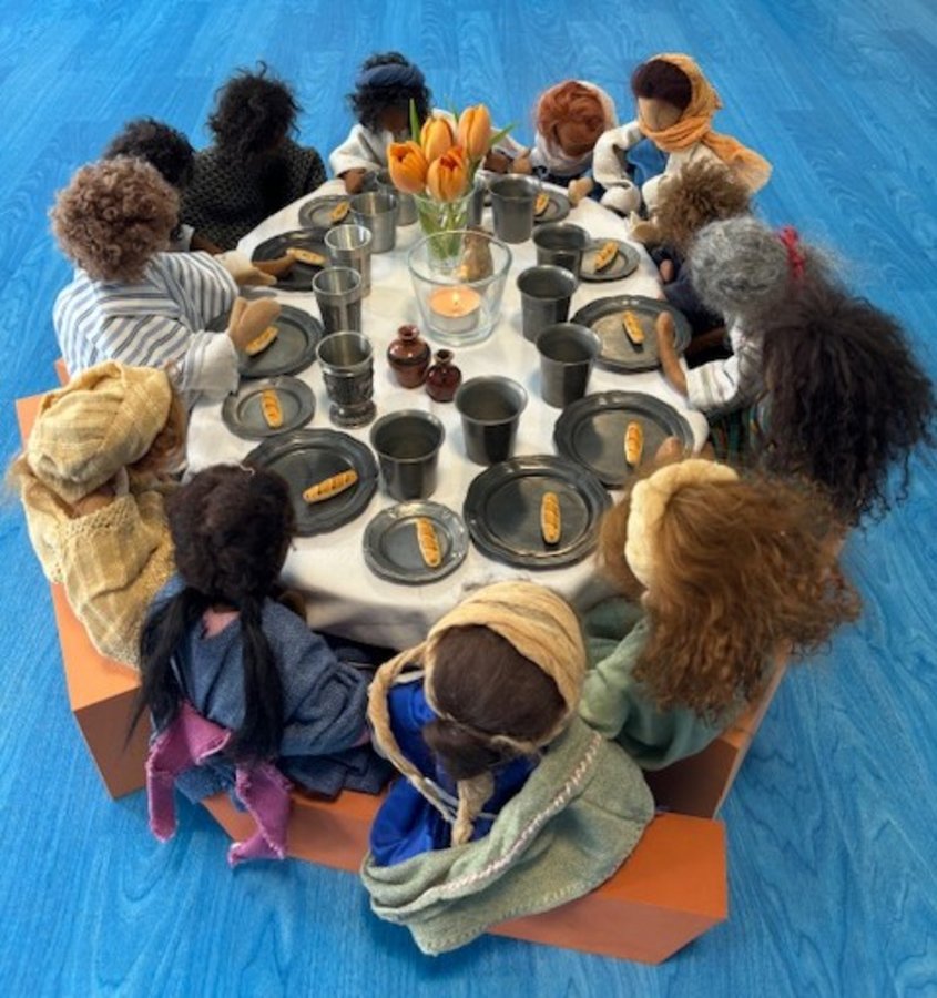 Mit biblischen Erzählfiguren - den sog. Egli-Figuren - wurden den Kindern die Inhalte der beiden Geschichten aus der Passion bildhaft gemacht. Die Figuren standen für Jesus und seine 12 Jünger. Die Kinder haben auf diese Weise eine kleine Vorstellung davon bekommen, wie die Menschen zur Zeit Jesu vielleicht ausgesehen haben. Auch die Namen der 12 Jünger waren für die Kinder ein wichtiges Thema geworden. Die meisten der heute doch recht fremd klingenden Namen konnten sich die Kinder gut merken. Beim Abendmahl, als alle nacheinander an den Tisch zu Jesus kamen, wurden alle Figuren nochmal mit den biblischen Namen begrüßt.
