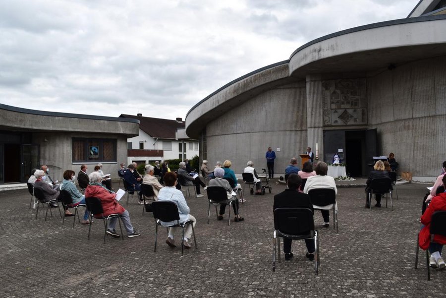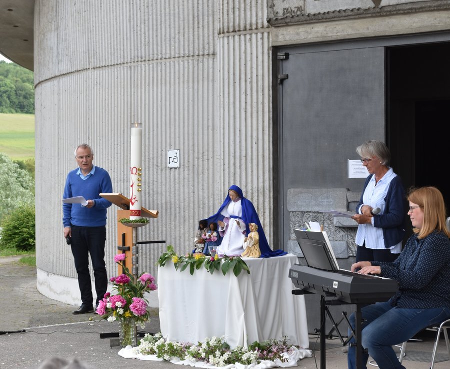 Um zumindest ein klein wenig an diese schöne Tradition anzuknüpfen, wurde in diesem Jahr zum ersten Mal eine Maiandacht im Freien angeboten. Dazu trafen sich 40 Teilnehmerinnen und Teilnehmer bei angenehmem Wetter auf dem Kirchenvorplatz in Herbitzheim. Pastoralreferent Klaus Scheunig und Wortgottesdienstleiterin Susanne Karl hatten die Maiandacht vorbereitet. Liebevoll von Margit Wesely geschmückt, wurde die Mutter Gottes, die sonst in der Weihnachtszeit in der Krippe in der Kirche steht, zum Blickfang für die Mitfeiernden. Maria hat viele Seiten - aber eine Seite kommt uns Menschen am nächsten. Nämlich: die Maria, die ihren Schutz wie einen Mantel über uns breitet und der wir all unsere Sorgen und Nöte mitteilen können. Nichts lag also näher, als diese Seite gerade in Zeiten der andauernden Pandemie zu betonen. So wurden symbolisch die alten und alleinstehenden Menschen, die Familien mit Kindern und alle Menschen, die des besonderen Schutzes bedürfen, unter den weiten Mantel der Barmherzigkeit - Sinnbild für Gottes Liebe und Zuwendung - gestellt. Organistin Julia Weyer sorgte für die musikalische Begleitung der Andacht, sodass die Marienlieder im Herzen mitgesungen werden konnten. Das, von Christina Weyer und ihrer Tochter Katharina vorgetragene, Ave Maria in der Mitte der Andacht nahm alle Gläubigen mit und rührte die Zuhörenden besonders an.